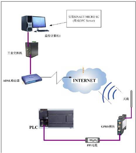 無線網(wǎng)絡(luò))無線連接(如圖 1)。通過 GPRS 與 S7-200 控制器相連。