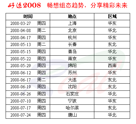 為了更好的與廣大用戶分享紫金橋軟件近年來的新技術、新發展,我們決定在2008年(奧運年)組織舉辦“好運2008,暢想組態趨勢,分享精彩未來”全國城市巡展活動,紫金橋足跡將遍布全國14個城市,橫跨南北中國,好運2008--紫金橋組態軟件技術盛宴將于3月27日在上海拉開序幕,之后好運北京、好運杭州、好運長春等城市巡展將依次拉開。