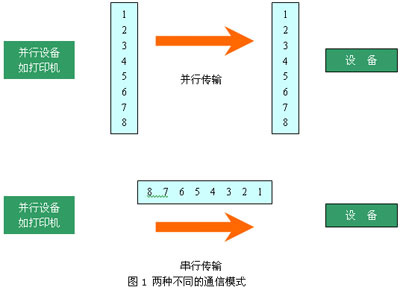 通常通信的形式可以分為兩種,并行通信(Parallel Communication)和串行通信(Serial Communication)。所謂并行,既是一次傳輸量為8位;而串行一次只傳1位。這兩種不同的通信模式如圖1所示。