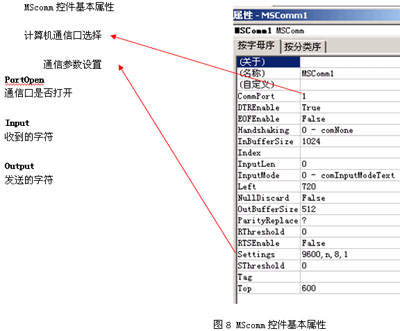 要完成VB與PLC等串行設備的通信,MScomm控件是一個很好用的控件。所以在此有必要對MScomm控件做一個較為詳細的說明。MScomm非標準控件,要手動添加,步驟如下:選擇菜單的【工程】;選擇【部件】;在彈出的對話框中做如圖選擇,在部件選項卡就會出現MScomm控件,如圖7所示。MScomm控件基本屬性如圖8所示。