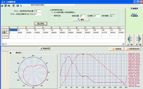 A2提供了一個軟件,利用這個軟件,客戶可以規劃出不同的凸輪方式,從而生成一條虛擬的電子凸輪曲線,并將該曲線以燒錄的方式,保存在A2伺服驅動器內部。當主動軸編碼器信號以脈沖方式進入到CN1中時,啟動電子凸輪,從動軸伺服電機就會根據這條內置在驅動器中的電子凸輪曲線而改變角度。