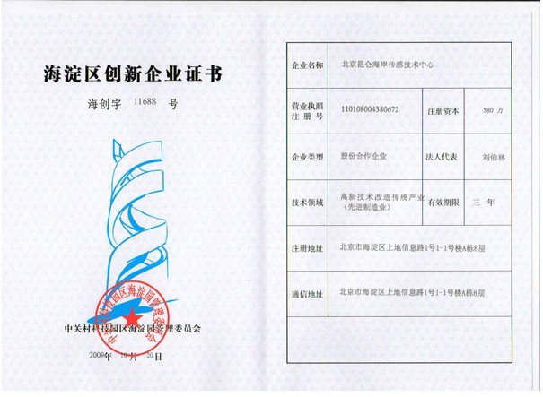 昆侖海岸近日被評為中關村高新技術企業,并取得海淀區創新企業證書。