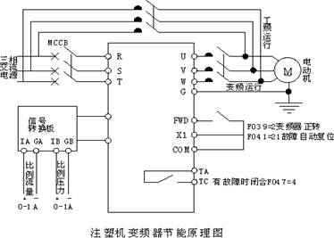注塑機(jī)的控制采用電腦板(單片機(jī)),其壓力設(shè)定,時(shí)序設(shè)定可按工藝條件人為給定,利用的電腦板輸出電量值,控制壓力比例調(diào)節(jié)閥,從而調(diào)節(jié)主油泵的壓力大小。它的輸出是個(gè)線性的電流mA量值,經(jīng)電流轉(zhuǎn)換器變成4-20MA,直接接入到變頻器控制輸入端,從而改變變頻器的輸出頻率,也即就改變了主油泵電動(dòng)機(jī)的轉(zhuǎn)速達(dá)到調(diào)壓、節(jié)電雙重作用。控制方案特點(diǎn):簡(jiǎn)便可靠、不需更改原電路、調(diào)節(jié)方便、控制精確。