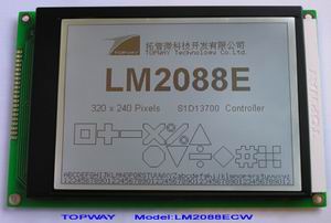LM2088系列產品特點 1、5.7寸320x240點陣,外形尺寸160x109x11.2mm 2、白色超亮LED背光,實現極佳的顯示對比度 3、結構完全兼容Optrex DMF50840系列 4、藍底白字,白底黑字顯示效果可選 5、提供控制器接口(S1D13700, RA8835),單片機接口版本等多種型號可選 6、可選配觸摸屏