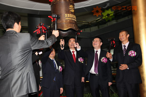 科士達公司董事長、深圳南山區領導與其它同批上市企業代表和領導敲響上市寶鐘