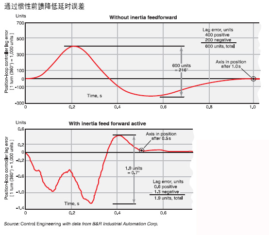 圖2:B&R IndustrialAutomation的伺服控制器提供慣性前饋整定(IFF), 在高難度整定應(yīng)用中能夠有效地降低延時(shí)誤差提高轉(zhuǎn)矩運(yùn)作, 確保運(yùn)動(dòng)軸快速定位,定位時(shí)間比原來縮減一半。 成熟的整定工具 GE Fanuc Automation公司伺服產(chǎn)品經(jīng)理Paul Webster先生指出現(xiàn)在有很多伺服整定技術(shù)。 而通常機(jī)床用戶只要將默認(rèn)參數(shù)載入伺服控制系統(tǒng),而不按照具體情況進(jìn)行整定。機(jī)器可能也運(yùn)行良好,不用再做任何調(diào)整。他介紹說默認(rèn)伺服設(shè)置適用于通用情況,能使系統(tǒng)保證基本系統(tǒng)運(yùn)作。只要做一些基礎(chǔ)的伺服整定就可以使機(jī)器運(yùn)作效率倍增。 除了默認(rèn)設(shè)置,F(xiàn)anuc 0i-C系列低端控制器還具有“一鍵設(shè)置”功能,能夠方便地進(jìn)行高精度參數(shù)初始化設(shè)置,而高端的Fanuc CNC系列提供的基于PC軟件也具備這種功能。Webster先生繼續(xù)介紹說,提高伺服系統(tǒng)運(yùn)行效率下一步就是根據(jù)波德圖整定速率增益和諧振濾波器。Servo Guide就是一款不錯(cuò)的整定軟件。 通過系統(tǒng)增益幅度(dB)和相角(deg.)對(duì)控制環(huán)路頻響進(jìn)行分析,波德圖可以評(píng)估出伺服系統(tǒng)的穩(wěn)定性。Webster先生提醒用戶需要關(guān)注哪些重要指標(biāo),包括系統(tǒng)最大帶寬(增益不變時(shí)的頻率范圍)、增益幅度為10dB時(shí)的頻率值、頻率衰減低于-20dB時(shí)的增益裕度。當(dāng)波德圖上無正頻率峰值,頻率衰減又低于-10dB,此時(shí)整定濾波器就能非常有效地消除諧振的影響。 GE Fanuc推出了與CNC配套的高級(jí)整定函數(shù),幫助用戶整定伺服系統(tǒng),獲得最 佳運(yùn)作效率。Webster先生告訴用戶公司為他們準(zhǔn)備的整定導(dǎo)航器方便實(shí)用,能夠幫助用戶順利完成整定各個(gè)步驟。 Noteworthy是一個(gè)動(dòng)態(tài)評(píng)估函數(shù),能夠自動(dòng)減少CNC應(yīng)用中產(chǎn)生的象限突起(或運(yùn)動(dòng)損失)現(xiàn)象。象限突起現(xiàn)象主要由系統(tǒng)內(nèi)部的空隙引起的,這些空隙可能是機(jī)械部件之間的物理空隙也可能是系統(tǒng)具有彈性而造成,這種現(xiàn)象也叫wind-up。這兩個(gè)明顯的因素會(huì)引起運(yùn)動(dòng)損失,造成系統(tǒng)滯后,在圓形圖上產(chǎn)生象限突起效應(yīng)。(見“運(yùn)動(dòng)損耗”圖)。 “我們利用“空隙加速”方法來消除象限突起現(xiàn)象,這種方法就是通過整定空隙數(shù)量并加入速率修正命令來消除造成運(yùn)動(dòng)損失的因素。”Webster先生如是說。動(dòng)態(tài)整定是一個(gè)連續(xù)不斷的過程,系統(tǒng)不斷整定直到運(yùn)動(dòng)曲線達(dá)到精度為止。Webster先生又補(bǔ)充說一旦進(jìn)入整定,整個(gè)系統(tǒng)整定過程就會(huì)自動(dòng)進(jìn)行。從某種意義上來說,CNC是基于系統(tǒng)初始誤差整定的。 其他伺服系統(tǒng)供應(yīng)商也為用戶提供了不同的運(yùn)動(dòng)損失補(bǔ)償方式。 不可忽略負(fù)載慣性 負(fù)載慣性與電機(jī)的慣性之間的比例系數(shù)也是一個(gè)重要的考慮因素。實(shí)際運(yùn)用中有很多系數(shù)值可用,而Baldor Electric推薦了負(fù)載慣性與電機(jī)慣性之比不大于10:1這一經(jīng)常被提到的系數(shù)。Mazurkiewicz先生解釋說,可能某些工程師會(huì)建議采用更高的慣性系數(shù),但不管如何關(guān)鍵是要降低“慣性失配”的概率同時(shí)又能降低整定的難度。 Bosch Rexroth也給用戶類似的忠告,他們建議用戶檢查“驅(qū)動(dòng)負(fù)載”的慣性大小。Bosch Rexroth高級(jí)應(yīng)用工程師Brian Van Laar先生解釋說負(fù)載慣性比電機(jī)慣性大許多的話,就很難進(jìn)行快速的速度變化和定位了。在某些減速運(yùn)動(dòng)中,負(fù)載會(huì)反過來帶動(dòng)電機(jī),引起過沖現(xiàn)象,致使穩(wěn)定時(shí)間增長。為避免慣性失配,他們公司給出了若干“適配標(biāo)準(zhǔn)”:快速定位<2:1,修正定位<5:1,高速率變換<10:1。 Mazurkiewicz先生介紹說避免慣性失配的方法之一就是在允許的范圍內(nèi)提高齒輪比或滾珠間距,這樣做能夠減少負(fù)載慣性對(duì)電機(jī)的影響。選擇電機(jī)的同時(shí)也要考慮選擇適當(dāng)?shù)凝X輪比和滾珠間距,當(dāng)然也不能忘記考慮電機(jī)的大小。 而另一方面,適當(dāng)?shù)恼ǚ椒ǹ梢缘玫胶芨叩膽T性系數(shù)。Baldor公司就提到他們做過的一個(gè)項(xiàng)目,他們?cè)?jīng)為一臺(tái)包裝機(jī)的伺服系統(tǒng)做過人工整定,當(dāng)時(shí)慣性系數(shù)高達(dá)144:1。他們一共花了6個(gè)小時(shí)才將系數(shù)整定到適合值。慣性失配值過高系統(tǒng)的響應(yīng)就會(huì)減小。Control Engineering1997年9月刊曾刊登名為“Electric Servos Do More with Less”的文章,就幾個(gè)高慣性負(fù)載應(yīng)用實(shí)例進(jìn)行過探討。 安裝電機(jī)注意事項(xiàng) Baldor公司Mazurkiewicz先生提到了電機(jī)安裝過程中常見的幾個(gè)問題: 由于供電電壓不足會(huì)導(dǎo)致電機(jī)運(yùn)行速度不夠。所以選擇電機(jī)時(shí),要確保10%的電壓余量,以防低電壓的情況;并檢測電機(jī)兩端電壓。 由于低估負(fù)載重量或是發(fā)生去磁現(xiàn)象(系統(tǒng)帶有磁鐵時(shí))會(huì)導(dǎo)