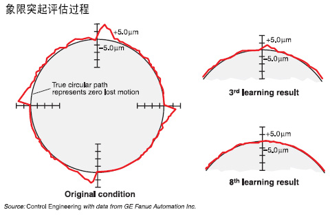 圖3:GE Fanuc CNC高級(jí)整定采用步進(jìn)式評(píng)估方式以減少機(jī)器運(yùn)動(dòng)損失。 圖示為一個(gè)二軸系統(tǒng)運(yùn)作圖,從圖中不難看出最初的運(yùn)動(dòng)損耗(象限突起) 現(xiàn)象在第8 次評(píng)估中已被消除。 發(fā)生電機(jī)過熱現(xiàn)象可能由于轉(zhuǎn)矩過長,換句話說就是電機(jī)尺寸過小,還有就是可能出現(xiàn)了紋波電流(用示波器可以觀察到)。Mazurkiewicz先生解釋道整定不當(dāng)或是反饋設(shè)備校正不當(dāng)會(huì)引起紋波電流現(xiàn)象,他同時(shí)提醒用戶不要用手試探電機(jī)的溫度。尺寸合適的無刷伺服電機(jī)室溫下的工作溫度可達(dá)100℃~125℃! 關(guān)注電機(jī)反饋設(shè)備 檢查分解器工作是否正常時(shí),用歐姆表測量其阻值并檢查電機(jī)連接是否正確。檢查編碼器:采用5V電源供電,檢查信道A和信道B,用示波器觀察在信號(hào)±A和±B之間是否有5V方波。不要讓反饋設(shè)備的電線纏在一起。 一些機(jī)電控制則對(duì)反饋設(shè)備采取交替檢查的方式。像是Baldor Seriers II驅(qū)動(dòng)就具有“反饋出錯(cuò)提示”功能,可以檢測是否遺失信號(hào)補(bǔ)償并報(bào)錯(cuò)。