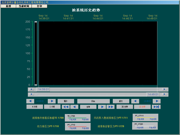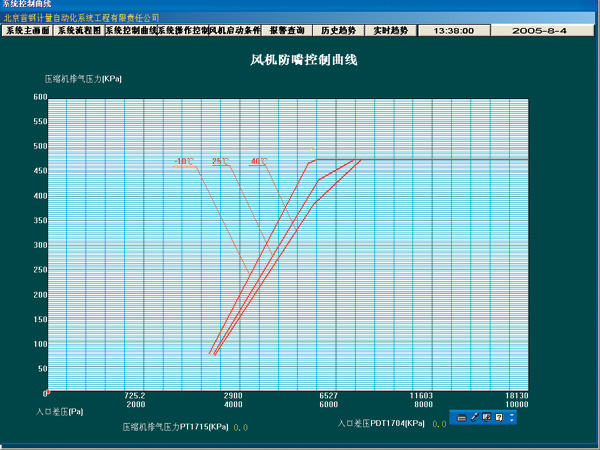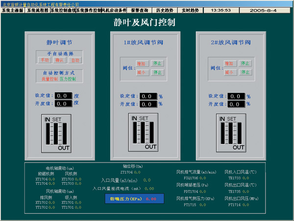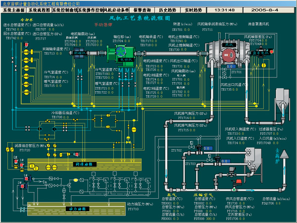 選定硬件設備后,需要按照如下的順序安裝熱備系統: ■安裝本地站和遠程站的電源模塊,CPU,RIO處理器,hot standby 模塊,TCP/IP模塊到背板,需要注意的是熱備系統兩個底板上安裝的模板種類和順序必須一致。兩個CPU地設備地址設定必須相同。兩個Ethernet模塊的IP地址設定必須相同。hot standby 模塊的指定滑動開關必須一個設定為A,另外一個設定為B. ■連接網絡,包括安裝RIO網絡和Ethernet網絡,按照網絡結構圖,分別安裝RIO處理器和遠程站之間的分支器和F接頭,連接RIO站間的同軸電纜,Ethernet交換機和網線; ■連接兩個hot standby 模塊之間的光纖。 編程和上位監控系統 首先確定編程和上位監控系統與PLC之間選擇TCP/IP的通訊協議。組態軟件Concept和上位監控軟件都支持TCP/IP的通訊協議,只要將網絡搭建起來即可。遷鋼公司7000立方米風機熱備系統選用TCP/IP的通訊協議,需要的主要設備如下: ■編程和上位監控系統微機需配備Ethernet網卡; ■為了與熱備的PLC通訊,需要安裝Ethernet交換機; 另外,為了開發出理想的監控系統,選擇的監控軟件是美國TCPWonderware公司開發的InTouch8.0。InTouch是一個集成的、基于組CP/IP件的MMI系統——FactorySuite 2000中的一個核心組件。它具有美觀的HMI(人機接口界面)和面向對象的圖形開發環境,能夠高效、快捷地配置用戶的應用程序。其在穩定性,開放性,網絡功能,數據庫功能等方面都具有很大的優越性。使用INTOUCH開發的監控畫面包括顯示系統工藝過程的主畫面,潤滑系統,軸振系統,軸位移系統等監控畫面,以及報警、歷史曲線、實時曲線和報表等。系統的主要監控界面如圖1,圖2,圖3,圖4所示。