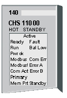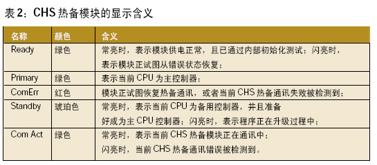 圖9:CHS 熱備模塊的顯示面板 另外,還需要設定Hot Standby 擴展屬性,Hot Standby 擴展屬性包括的內容如圖8所示: 使用Concept軟件提供的Hot Standby擴展屬性組態界面指定Hot Standby如下屬性: ■指定Hot Standby 命令寄存器參數; ■定義非傳送區域地址范圍,以減少CPU的掃描周期; ■定義CPU啟動后的工作狀態,相互熱備的CPU哪一個處于ONLINE狀態; ■定義處于熱備的CPU在程序發生不匹配時所產生動作,是由熱備轉為自動離線還是由熱備轉換為運行; ■定義當相互熱備的CPU工作狀態相互切換時要交換設備地址的通訊口,包括MODBUS口1,2,3; ■使能或者禁止邏輯映象按鈕忽略; ■定義執行邏輯升級時CPU所采取的處理方式,可以選擇“不用停機”也可以選擇“使用停機”方式; 完成上述的硬件配置和設定工作之后,分別將項目的配置下裝到兩個CPU中,熱備系統就已經建立起來。需要注意的是在向CPU中下裝組態時,需要先將兩個CPU的備用電池取下,至少10分鐘以上,以確保CPU在下裝組態之前存儲器中沒有任何數據。 熱備PLC系統常見故障及處理 熱備系統的硬件網絡結構圖如圖1所示,熱備CPU通過高速光纜連接,CPU的每個掃描周期均以10M通訊速率,實時由主CPU向備CPU傳輸數據及狀態信息,熱備系統具有自動程序下裝功能,快速、有效只需下裝一次程序,配置不需要編程工作,CHS模塊熱更換-無停機時間。 CHS熱備模塊的顯示面板如圖9所示,其主要顯示燈含義如表2。