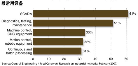 以太網的應用在增加,但仍然與模擬以及數字技術同時使用,美國工廠里的網絡基礎設施好像一個大雜燴。 在美國的工廠里,網絡基礎設施依然好像一個大雜燴:新的和舊的,數字的和模擬的,連接的和分離的。一項由Control Engineering和Reed研究公司推動的關于CE讀者使用和選擇工業網絡和通訊情況的調查,有了一些新的發現。 調查收到了213個反饋,這些反饋者負責選擇,推薦和/或購買工業網絡產品。根據反饋的結果,網絡具以多種形式在相當廣泛的范圍內存在。通訊可以簡單的如同一個的傳感器,通過4-20mA信號來顯示,也可以是橫跨企業到工廠多個層面的以太網平臺。 多數公司(61%)使用網絡驅動的SCADA(數據采集和監控系統)系統(見最常用設備圖),而很多公司(51%)把它的功能拓展到診斷,測試及維護。另外的一些回答建議把離散和流程工業的需求分開。