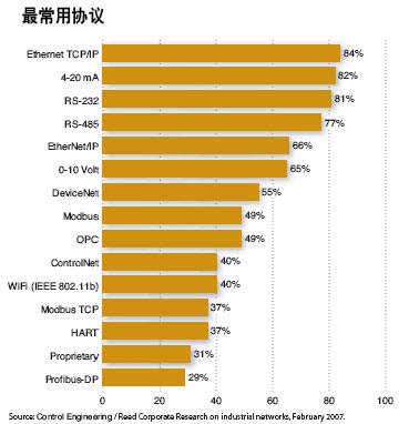 SCADA 和診斷系統應用于各行各業,但是離散和流程工業由于兩者控制功能不 同,而開始分道揚鑣。 最常用的協議反映了哪些是典型的應用(見最常用協議圖)。模擬量技術,如4-20mA和0-10V仍舊很常用,可以排在前10位,但是有很少有人將 簡單設備的外部與I/O接口連接。以太網平臺,Ethernet TCP/IP協議和EtherNet/IP協議分別應用在84%和66%的工廠里,這就暗示了在更為高級的設備之間需要更寬的網絡。一批古老的協議如RS-232和RS-485還在用作小型簡單或幾個節點網絡的平臺。