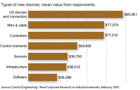 這張表說明:有非常多的網絡協議在使用,而每一個都有其用途及目的 商業以太網和現場總線平臺家族非常強大,由ODVA組織領導,其中的EtherNet/IP,DeviceNet和ControlNet都在最常用排名的前10位。Modbus和Modbus/TCP排名第二,而Profibus和基金會現場總線排名第三和第四。 應用技術的變革是很緩慢的,因此這也造成很難看出潮流的走向,但是無線技術,特別是WiFi(IEEE802.11b)顯示了長足的發展,2005年有35%的使用者,2006年差不多,有34%的使用者,而今年這個數字上升到了40%。其他的無線技術(包括RFID)都在發展,以下是未來12個月預計新用戶的增加比率: ● RFID, +17%; ● ZigBee (IEEE 802.11g), +16%; ● WiFi (IEEE 802.11b), + 14%; 及 ● Bluetooth (IEEE 802.15), +13% 同時,仍然有大量的硬件沒有連入網絡。雖然PLC設備和以太網設備(集線器,交換器,路由器等)是作為一個大型網絡的一個集成部分,但是其他的一些設備都可以不用與網絡相連。實際上,平均來講,略微超過半數的設備及傳感器還是沒有與網絡相連,如果計劃在未來12個月里一切都順利的話,超過50%的過程傳感器和分離式傳感器,開關及閥門將連入網絡,平衡也將就此改變。 網絡需要對硬件和軟件都進行維護和拓展。很多受訪者表示有計劃擴大升級他們的基礎設施(見購買計劃表)。每年I/O設備和連接器都位于預算表的首位,緊接著的是電纜和控制器。在圖表中顯示的數據是所有受訪者他們各自公司對于給定的產品類別的購買計劃的平均值。 網絡硬件供應商 在今年的調查中被受訪者認為最頂級的四家網絡硬件產品供應商分別是羅克韋爾自動化公司,Belden公司,施耐德電氣和菲尼克斯電氣。以下這些是這些公司各自具有代表性的產品。 ● 本文可以以在線模式進行游覽,與超過50家的工業網絡相關的銷售商相連。盡 www.controleng.com/archive ●尋找其他供應商盡 www.cesuppliersearch.com ● 尋找專業的系統集成商盡 www.controleng.com/integrators. ● 只要注冊即可免費獲取控制工程產品研究報告 未來12 個月的新設備購買計劃
