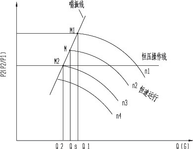 圖1:離心式氣體壓縮機喘振限直線及隨動防喘振控制操作線示意圖