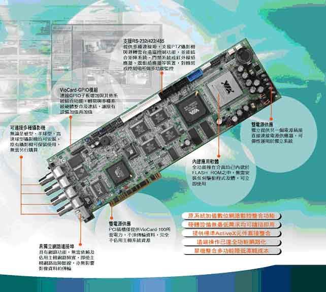 威達電所推出的VioCard-100與一般數(shù)字監(jiān)控卡不同,為一獨立運作系統(tǒng),卡上配備CPU及內(nèi)存,所需能耗可以通過PCI插槽或電源插座直接由電源供應(yīng)器提供,無須其它主機資源即可運作,沒有最低系統(tǒng)需求限制,不會消耗原有主機CPU效能,數(shù)據(jù)傳輸也不受PCI總線頻寬限制,擺脫傳統(tǒng)數(shù)字監(jiān)控卡受制于主機系統(tǒng)效能的瓶頸難題。VioCard-100還具有獨立網(wǎng)絡(luò)連接端口,無須共享主機網(wǎng)絡(luò)帶寬,即使主機Down機或主機網(wǎng)絡(luò)功能故障,影像數(shù)據(jù)傳輸也不受影響。