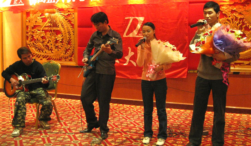 晚宴和穿插其中的晚會節目開始了!精神文明與物質文明,吃、喝、玩、樂永遠是連體的!在享受著美食的同時,也享受臺上的歌舞表演,碰到好運氣的,手上還抱著抽到的獎品。同樣,特等獎也是與去年一樣,由彭總贊助的諾基亞手機一臺,全場員工翹首以待。容易得到的不一定是好東西,但是,好東西肯定來之不易。經過一場集智慧與運氣以及部門團結力量的一場游戲中分出二等獎、一等獎和特等獎。財務部是本年活動中最好運氣的部門,同時,也是本晚晚宴最好運氣的部門,因此,最后的特等獎也是落在財務部,該部門除獲得最大獎項外,連同整個部門都取得了紀念獎。