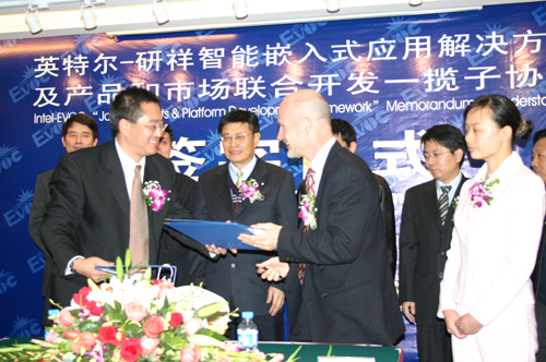 ——研祥智能與英特爾簽訂嵌入式應用解決方案及產品和市場開發一攬子協議 2005年12月8日,由研祥智能科技股份有限公司和英特爾公司共同在深圳簽訂的,“英特爾-研祥智能嵌入式應用解決方案及產品和市場開發一攬子協議”將注定成為中國嵌入式領域的一座里程碑。研祥智能科技股份有限公司董事局高層領導,包括英特爾IPD全球總經理、英特爾IPD亞太區總監在內的英特爾公司高層領導親臨現場,深圳市領導到場祝賀并發表重要講話。