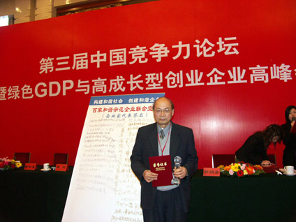 2005年12月10日,由中國新聞社主辦的“第三屆中國競爭力論壇暨綠色GDP與高成長型企業家高峰會”在北京人民大會堂隆重開幕。會議圍繞“倡導‘十一五’綠色成長理念,打造高成長型企業”的主題與企業家、政府官員及經濟學家,就“十一五規劃政策熱點解讀”、“綠色GDP時代高成長型企業機遇與挑戰”等多個話題相互切磋,共同創新,為企業在未來綠色GDP時代持續高成長之路尋求共識。中國新聞社總編輯郭招金致歡迎辭,第九屆全國政協副主席王文元,國務院西部開發辦副主任、中國宏觀經濟學會副會長曹玉書致辭,北京大學教授、博導、全國政協常委蕭灼基,國家環保總局中國環境規劃院總工程師王金南作主題發言。隨后,大會公布了中國新聞社評價中心評價的2005年中國最具競爭力高成長型創業企業500強,我公司入選500強,名列第十八位。公司總裁李慕松先生被評為“2005年中國(中小)優秀創業企業家”。