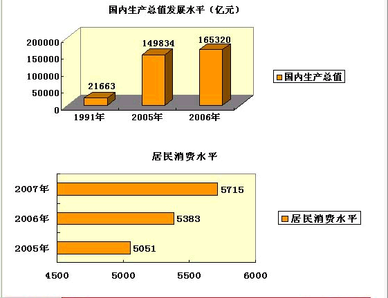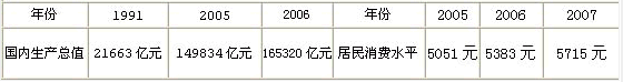 我國經濟持續高速發展,國內生產總值從1991年的21662.5億元將增加到2005年的149834.1億元,通過時間序列分析可預測,在95%置信度下2006年國內生產總值將增至165320億元。城鄉居民收入水平也不斷提高,中國經濟將繼續保持穩定增長,居民電力消費量將相對增加,對電器產品的消費支出也將會進一步加大。我國居民消費水平逐年上升,居民生活質量穩步提高, 2005年居民消費水平為5051元,通過預測2006年居民消費水平為5383元,2007年居民消費水平為5715元。人們精神需求日益豐富和多元化,對電力需求也不斷增加。如下圖所示: