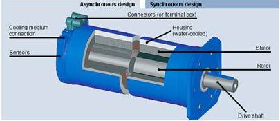 該型電機分為異步和同步設(shè)計,采用在定子外殼設(shè)計的水冷層來實現(xiàn)水冷,進(jìn)水口和出水口設(shè)計在電機的后端,流經(jīng)整個電機機身后經(jīng)另一個出口出水。