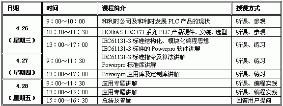 培訓期間,和利時公司為學員提供全套的G3 PLC資料以及免費工作餐,培訓時間及課程內容安排如下: