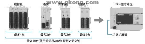 ·新增了高速輸入輸出適配器,模擬量輸入輸出適配器和溫度輸入適配器,這些適配器不占用系統(tǒng)點(diǎn)數(shù),使用方便,在FX3U的左側(cè)最多可以連接10臺(tái)特殊適配器。