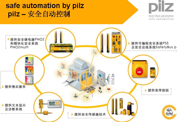 Pilz公司作為安全領域的大使在許多領域都有其的產(chǎn)品:PNOZ安全繼電器、PSS可編程安全系統(tǒng)和安全總線SafetyBus p。Pilz擁有一系列相互適用的產(chǎn)品,同時為客戶提供了各類應用合適的解決方案——無論您需要達到最簡單的安全要求,還是需要控制的復雜設備。