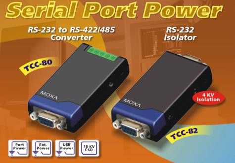 TCC-80: 串口供電的RS-232 到 RS-422/485 轉換器,具備 15 KV ESD 浪涌保護 TCC-82: 串口供電的RS-232 隔離器,4通道的4 KV隔離,并且具備 15 KV ESD浪涌保護