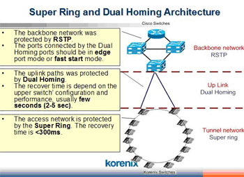 主干環(huán)上的交換機(jī)比葉結(jié)點(diǎn)交換機(jī)優(yōu)先級(jí)更高。所以,如何兼容使用不同冗余協(xié)議的葉結(jié)點(diǎn)交換機(jī)顯得非常重要。RSTP 是冗余網(wǎng)絡(luò)應(yīng)用中最普遍的一種解決方案. 如果您需要快速的恢復(fù)時(shí)間Super Ring是最佳選擇,針對(duì)不同品牌交換機(jī)如Cisco交換機(jī)的兼容性問題Dual Homing是最佳方案.