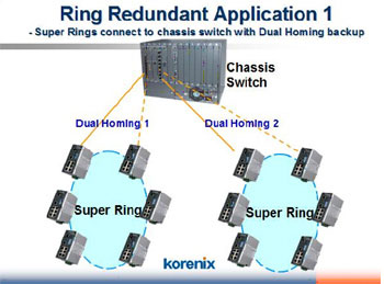 當(dāng)需要把Super Ring 自愈環(huán)接入到這些交換機(jī),Dual Homing是最簡(jiǎn)單的一種實(shí)現(xiàn)方式。 將Dual Homing交換機(jī)連接到其中一個(gè)通訊模塊,這兩個(gè)端口可以互相備援。在這種應(yīng)用環(huán)境中,要求區(qū)別于不同VLAN組或IP子網(wǎng),建立獨(dú)立的Super Ring。 此兩個(gè)Super Ring是相互獨(dú)立的,而不同的VLAN組或子網(wǎng)能通過路由到達(dá)。