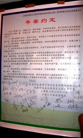 會議結束后,所有代表在行業協會起草的共識文件《豐泰約定》上簽下了自己的名字,對根植深圳、發展裝備制造產業、加強創新能力和科技含量、打造高素質產業隊伍,以及重視環保、營造和諧產業等內容形成共識。