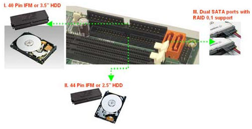 KINO-6612支持多種存儲器解決方案,例如44 Pin IDE,40 Pin IDE,和2個SATA接口