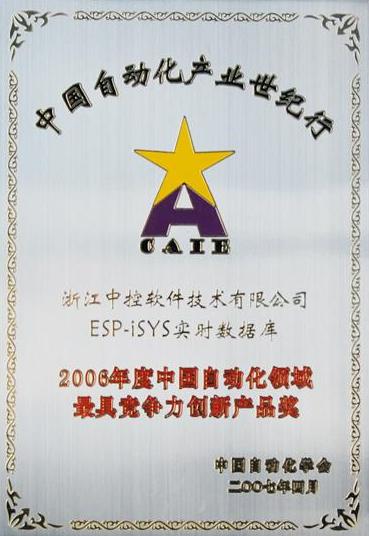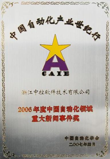 “中控成功舉辦實時數(shù)據(jù)庫ESP-iSYS 4.0產(chǎn)品發(fā)布會”獲中國自動化學(xué)會頒發(fā)的2006年度中國自動化領(lǐng)域重大新聞事件獎。