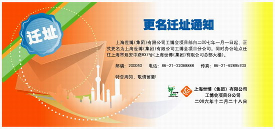 此外,根據(jù)國家七部委、上海市政府及工博會組委會辦公室對工博會項目提出的最新要求,自2007年1月1日起,作為“工博會”的唯一承辦單位上海世博(集團(tuán))有限公司,正式成立“上海世博(集團(tuán))有限公司工博會項目分公司”,代表世博集團(tuán)執(zhí)行“工博會”項目的所有承辦職責(zé)。同時辦公地遷往世博集團(tuán)總部大樓,上海市延安中路837號(郵編200040)。