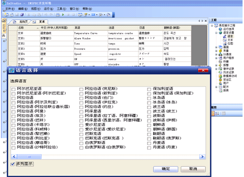 “易控(INSPEC)”組態(tài)軟件的多語(yǔ)言功能包括“系統(tǒng)多語(yǔ)言”和“工程多語(yǔ)言”。系統(tǒng)多語(yǔ)言針對(duì)設(shè)備制造商或系統(tǒng)集成商的工程技術(shù)人員。也就是說(shuō)世界各地的工程技術(shù)人員都可以用自己熟悉的語(yǔ)言來(lái)使用“易控(INSPEC)”來(lái)開(kāi)發(fā)自己的工業(yè)自動(dòng)化監(jiān)控系統(tǒng)。工程多語(yǔ)言則針對(duì)最終用戶,它使得銷往世界各地的設(shè)備或者系統(tǒng)都可以讓當(dāng)?shù)氐牟僮魅藛T以自己的母語(yǔ)來(lái)進(jìn)行監(jiān)控操作,而且為了銷往不同國(guó)家的設(shè)備或者系統(tǒng),雖然語(yǔ)言界面不同,但設(shè)備制造商或系統(tǒng)集成商所作的工作僅僅就是一個(gè)翻譯的工作,傳統(tǒng)的大量開(kāi)發(fā)和測(cè)試工作都因?yàn)椤耙卓?INSPEC)”的多語(yǔ)言功能而省略。