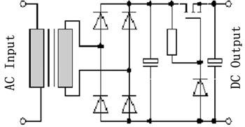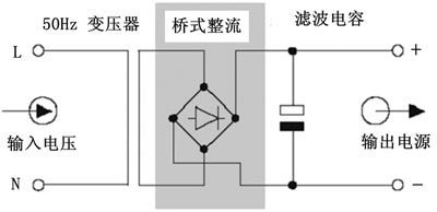 對于一個非工業穩壓直流電源來講,其電路非常簡單,交流輸入電壓經過一個50Hz的變壓器降壓后,進行橋式整流,再經過濾波電容進行濾波,然后產生輸出的直流電壓。