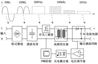 在開關穩壓電源中,交流輸入電壓直接進行整流,進行濾波,然后又逆變為交流,這些逆變操作是在頻率40kHz~180kHz的功率開關晶體管進行。這時產生的矩形波電壓通過一個高頻變壓器進行變壓或降壓,開關穩壓電源中于線性穩壓電壓的區別在于開關電源是先整流后變壓,穩壓電源是先變壓后整流的。