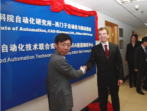 2006年12月13日,“中國科學院自動化研究所與西門子(中國)有限公司自動化與驅動集團先進自動化技術聯合實驗室——ASEA技能測試中心”落成儀式在京舉行。中科院自動化所-中自三博控制工程公司董事長陳良懷,西門子自動化與驅動集團自動化系統部總經理斐德思,中科院自動化所綜合自動化技術工程中心主任、中自三博控制工程公司總經理林紅權等出席了落成儀式。