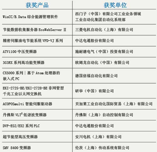 共有12種創(chuàng)新節(jié)能產(chǎn)品獲得了“2009年度中國自動(dòng)化領(lǐng)域創(chuàng)新節(jié)能獎(jiǎng)”(詳見下表所示)。