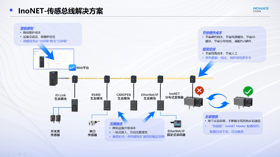 在快遞、機場、鋰電、光伏物流等長線體輸送線場景中,傳統電氣架構方案往往面臨傳感器與IO布線困難、生產節拍難以提高(掃描周期長)、不支持靈活擴展等瓶頸。
