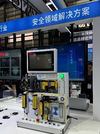 功能安全解決方案展臺中,將“兩提四節雙安全”中“安全”板塊,進行重點展示。“路過必玩”的demo演示裝置,生動地把安全傳感、PLC、IO、驅動系統、安全可視化方案聯合展示。傳感全面展示安全光幕、門鎖、繼電器,其中光幕響應時間4軸僅4.2ms,保護距離12m,業內領跑20%。