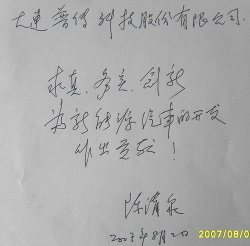 2007年8月3日,2007混合動力汽車控制技術研討會第二次會議哈爾濱召開,參會期間,全國政協委員、國際電動車領域權威專家陳清泉院士聽了普傳科技關于混合動力汽車關鍵部件電機及控制器的技術和產業化發展介紹后欣然題詞:“求真、務實、創新,為我國新能源汽車發展做貢獻”。