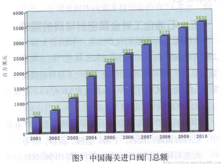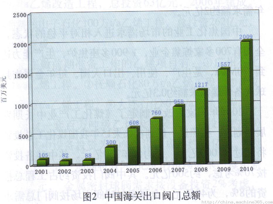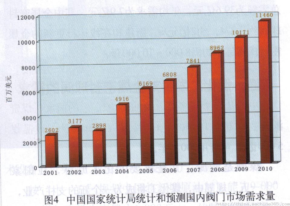 根據(jù)對中國海關統(tǒng)計,2005年閥門出口總額為7.60億美元。預測2010年閥門出口總額為20.09億美元。7005午,進口總額22.59億美元。頂側(cè)2010年閥門進口總額為36.32億美元。中國國家統(tǒng)計局統(tǒng)計2005年國內(nèi)對閥門的總需求量為61.69億美元 (國內(nèi)銷售收人+進口額-出口額)。預側(cè)2010午閥門的總需求量為114.60億美元。
