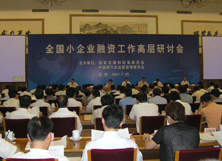 2007年7月26日,由國家發展改革委、中國銀監會聯合主辦的“全國小企業融資工作高層研討會”在北京召開。全國政協副主席黃孟復出席開幕式并致辭。中國銀監會主席劉明康、國家發展改革委副主任歐新黔做主題演講。中財辦、國務院研究室、財政部、國家稅務總局等部委領導,國務院發展研究中心、世界銀行、社科院以及部分銀行業金融機構、擔保公司的代表做主題發言。