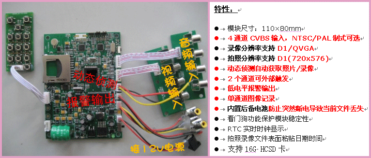 可廣泛應(yīng)用于安防,車載、家居、企業(yè)、社區(qū)、商鋪等領(lǐng)域的視頻監(jiān)控。 模塊尺寸:110× 工作電壓:DC12V 4通道CVBS輸入,NTSC/PAL制式可選 錄像分辨率支持D1/QVGA,拍照分辨率支持D1(720x576) 動態(tài)偵測自動獲取照片/錄像 2個外部觸發(fā)腳進(jìn)行手動控制 單通道圖像記錄,每個通道的文件單獨(dú)記錄 后備電池以防突然斷電保存不了當(dāng)前文件 看門狗功能保護(hù)模塊穩(wěn)定性 RTC實時時鐘顯示,拍照錄像文件表面粘貼日期時間 支持