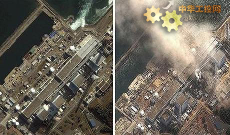 圖為福島第一核電站爆炸前(左)后(右)對比圖。
