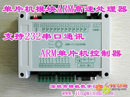 JMDM-12DI8DO 工業級ARM控制板功能詳解 一、特性 1. JMDM-ARM20DIOMR 工業級ARM控制板采用ARM 32位的Cortex™-M3 CPU,128K閃存程序存儲器;20K的SRAM。 2. 主電源采用18V交流電(或24V直流電),外圍驅動電源采用24/12V直流電; 3. 12路光電隔離數字量輸入,NPN輸入形式,輸入電流為10mA; 4. 8路繼電器輸出(可接220V電壓,最大承受電流是5A),采用光電隔離和啟用內部看門狗及嚴格的高頻濾除特性,使系統工作穩定可靠,無死機現象; 5. 有1路標準的RS232串行通信接口(抗15KV靜電沖擊),可直接與電腦或文本顯示器等外設通信; 6. 可直接通過RS232接口下載程序,無需燒錄器,方便程序修改、升級; 7. 有一盞LED燈顯示工作狀態,有一個撥碼開關可根據程序需要設定程序狀態或程序參數; 8. 外殼采用螺釘固定或導軌安裝,一體化緊湊型設計。 外殼尺寸: 長×寬×高為: 145mm×90mm×40mm; 內部控制板尺寸: 長×寬×高為: 122mm×86mm×28mm; 9. 用Keil C 或匯編編程,用戶編程有困難的可把工藝流程發給我司,我司可幫助編程。 二、規格 1. 工作溫度:-10~+65°C; 2. 儲存溫度:-20~+80°C ; 3. 濕度:5~95% 無凝結 ; 4. 功耗(無外部設備): +18V@ 0.5A (典型值) ; 三、用途 1. 可用于各種20個點以內的控制系統,可控制氣缸,電磁閥,繼電器,步進電機,可外接光電式,電容式,電感式,霍爾式等各種傳感器; 2. 可用于替代20點以內的PLC用于各種控制場合(如各種機器控制); 3. 可用于ARM學習和試驗。 四、編程說明 1. 在接線圖上標明了輸入輸出端口所對應的是控制板的輸入輸出口: 1)In(x): 當In(x)函數返回0時就說明第x個輸入點有信號; 2) out_bit(x,0):打開第X點輸出; 3) out_bit(x,1):關斷第X點輸出; 軟件資料中有范例程序,用戶可以在這基礎上修改學習