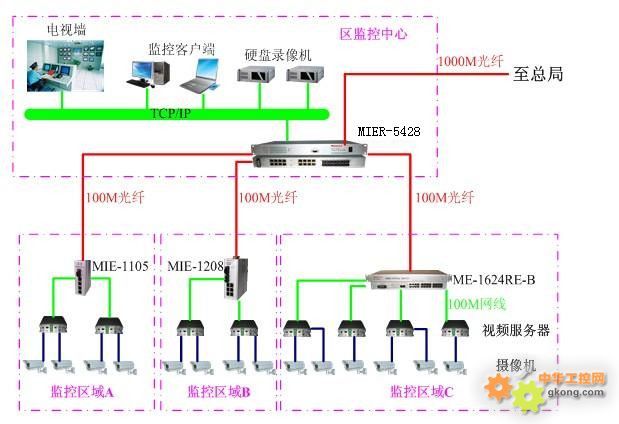 在不同的監(jiān)控區(qū)域,選擇使用不同的交換設(shè)備,如在視頻服務(wù)器不多地區(qū)域使用5端口或8端口交換機(jī),而在視頻服務(wù)器數(shù)量較多的區(qū)域使用16或24端口交換機(jī),并使用交換機(jī)的光纖接口使用專用光纜傳輸至區(qū)監(jiān)控中心,由MIER-5428全光口光纖交換機(jī)對數(shù)據(jù)進(jìn)行匯聚,由MIER-5428交換機(jī)的1000M網(wǎng)絡(luò)接口傳輸至硬盤錄像機(jī)和電視墻。而至總局的傳輸則使用MIER-5428的1000M光纖接口來實(shí)現(xiàn)。