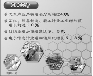 2009年十大產業調整和振興中,汽車產業表現最為搶眼,產銷增長分別超過四成,中國躋身汽車產量第一大國。石化、裝備制造、輕工行業工業增加值增長超過10%。紡織業增加值增速達9.5%。電子信息行業受國際金融危機沖擊較大,增加值同比增長5.3%,但其中筆記本計算機增長38.8%,手機增長9.8%;彩電增長9.3%,其中液晶電視機增長85.2%,成績不俗。