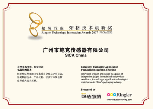 經過用戶推薦和專家公正評審,擁有超過60年生產研發傳感器歷史的施克公司憑借在包裝行業多年積累的深厚技術實力,為客戶帶來了成熟領先的產品和優質的服務,并將領先業界的行業解決方案理念帶入中國,對中國包裝行業的自動化進程做出了重大貢獻,榮獲“2007包裝行業榮格技術創新獎”。
