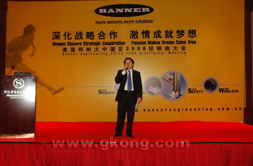 大會在上午9點開始,美國邦納大中華區(qū)董事總經(jīng)理胡勇先生回顧了邦納公司在過去一年里取得的輝煌成果和進步,展望2008年將是深化戰(zhàn)略合作,成就夢想的年度。胡總經(jīng)理堅信只有邦納公司和中國區(qū)的經(jīng)銷商們的互動溝通、精誠合作,才能在新的2008年中取得更輝煌的增長。廣大經(jīng)銷商根據(jù)各自自身不同的特點各抒己見,提出的具有針對性的見解及建議,現(xiàn)場氣氛團結(jié)熱烈,令人振奮。胡總經(jīng)理在開幕詞的最后總結(jié)了中國的自動化市場的過去和將來,指出2008年不僅對邦納將是一個機遇,對經(jīng)銷商也一次重要的機遇,2008年將是美國邦納和經(jīng)銷商們戰(zhàn)略合作,成就夢想,共創(chuàng)輝煌的年度。